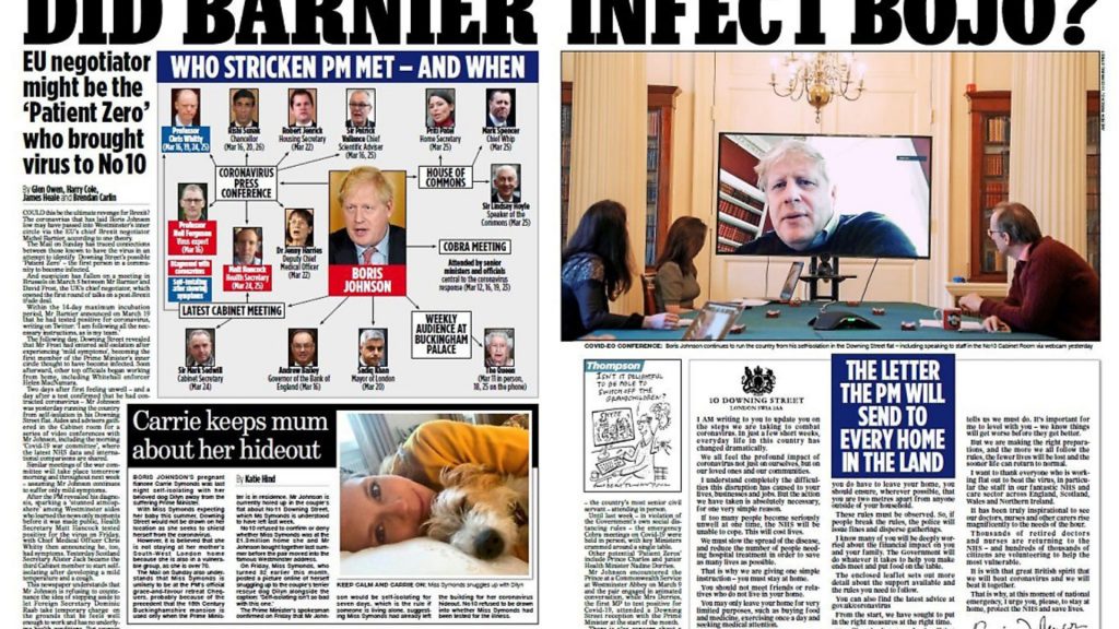 The Mail on Sunday devoted two pages to questioning whether it was EU negotiator Michel Barnier who brought the virus to Downing Street, in a report that begins ‘could this be the ultimate revenge for Brexit?’.